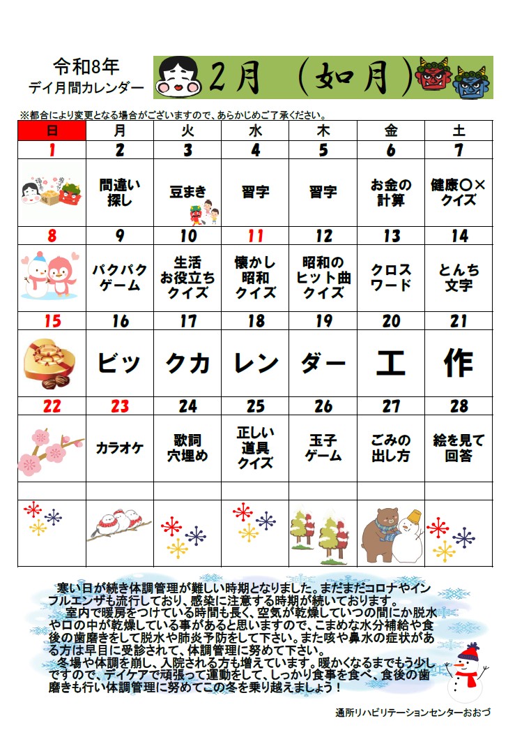 通所リハビリテーションセンターおおづの2月のレクリエーションカレンダーができました。