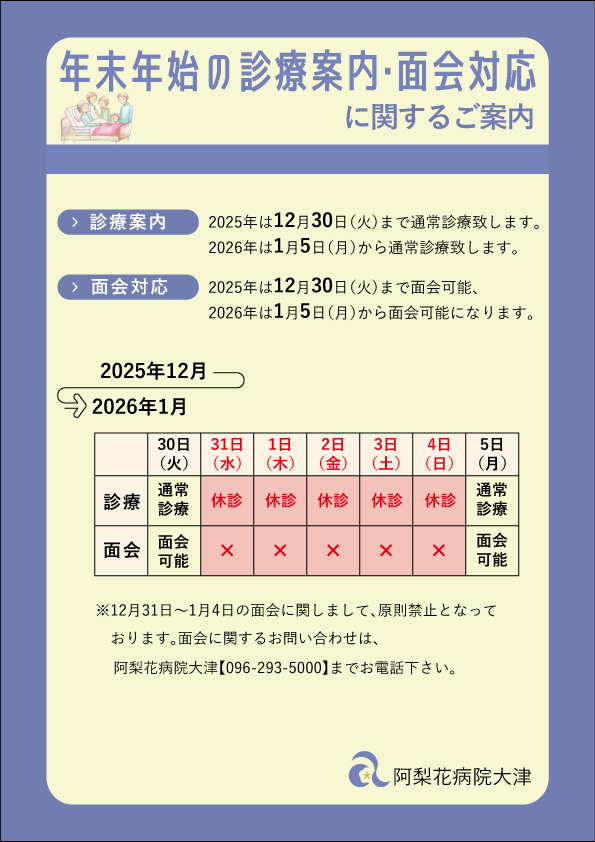 2025年12月31日から2026年1月4日まで阿梨花病院大津の外来診療、入院病棟のご面会は年末年始体制になります。